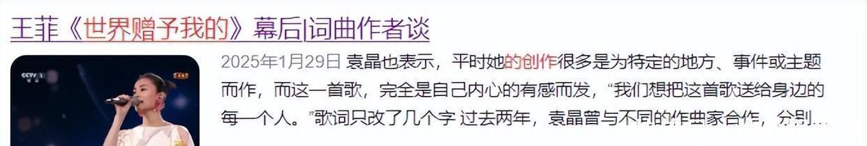 2025年央视春晚当王菲身着一袭白裙,在静谧的星空下唱起《世界赠予我的》时,空灵的嗓音仿佛让时间静止,这首歌能抵达亿万观众耳边,本身就是一个关于“真诚”的故事。