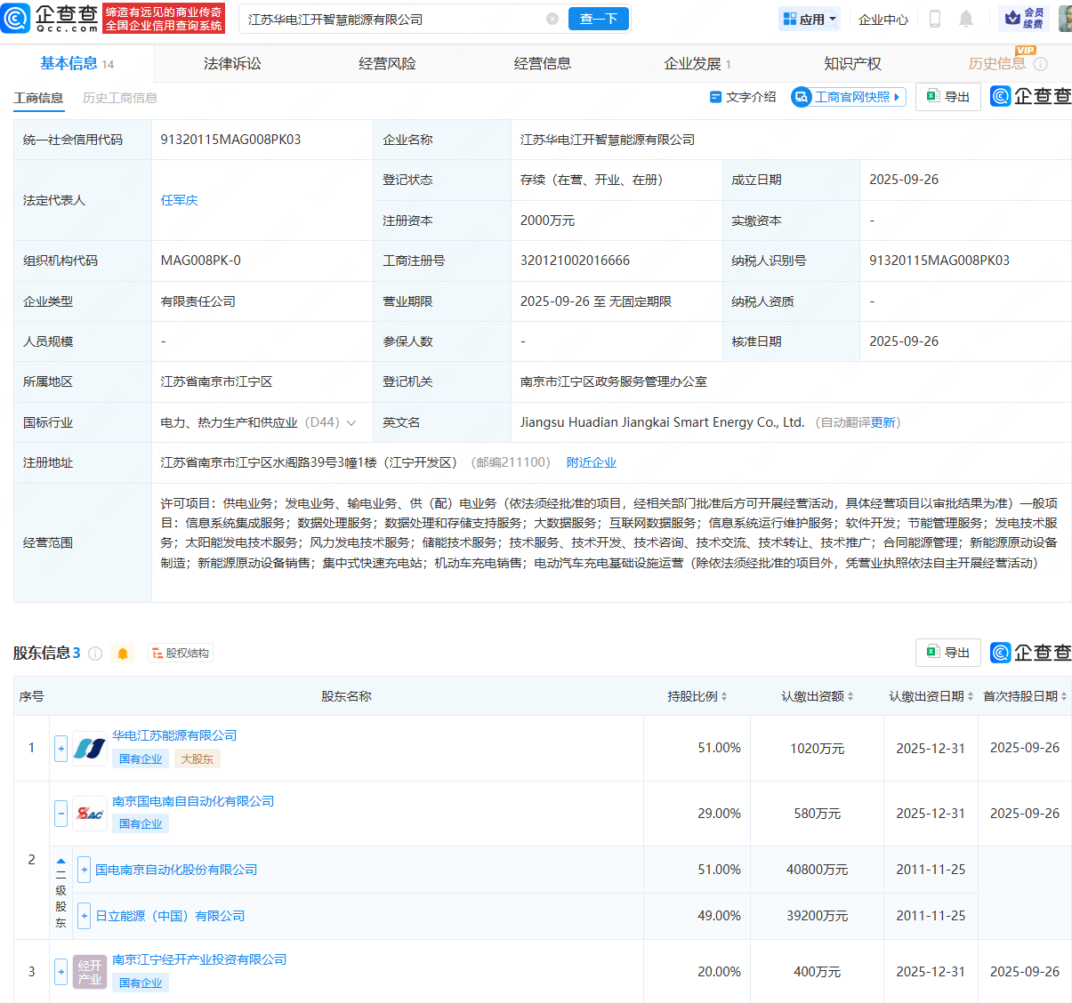 近日,江苏华电江开智慧能源有限公司成立,法定代表人为任军庆,注册资本为2000万元,经营范围包含:供电业务;发电业务、输电业务、供(配)电业务;数据处理服务;数据处理和存储支持服务等。企查查股权穿透显示景盛配资,该公司由华电江苏能源有限公司、国电南自(600268)控股子公司南京国电南自自动化有限公司等共同持股。