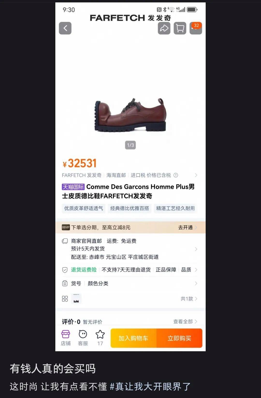 经视直播记者查询电商平台发现,这款名为CommeDesGarconsHommePlus的男士皮质德比鞋,根据尺码不同,定价分别为26658元与31680元(其中包含5280元进口税)。