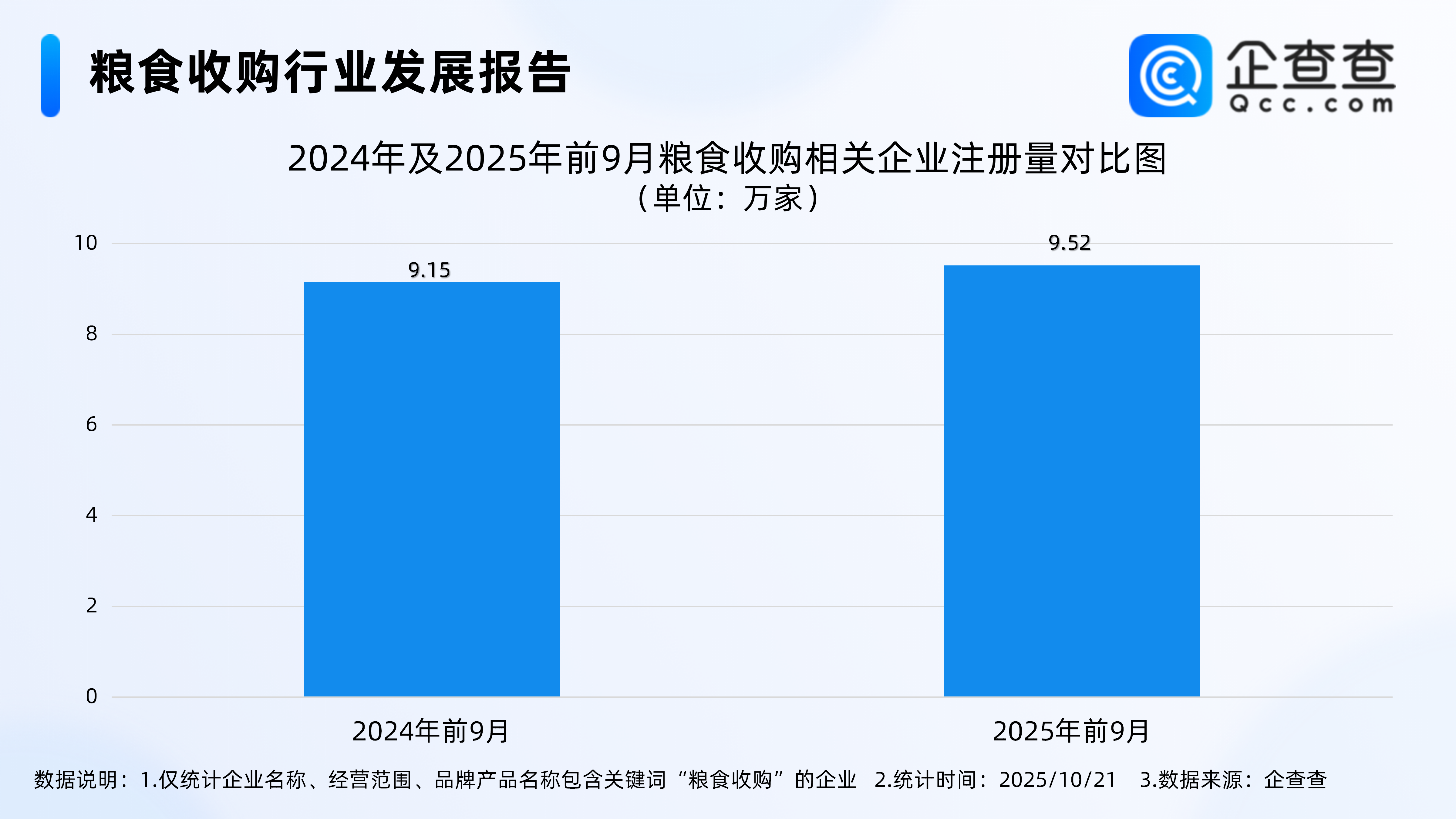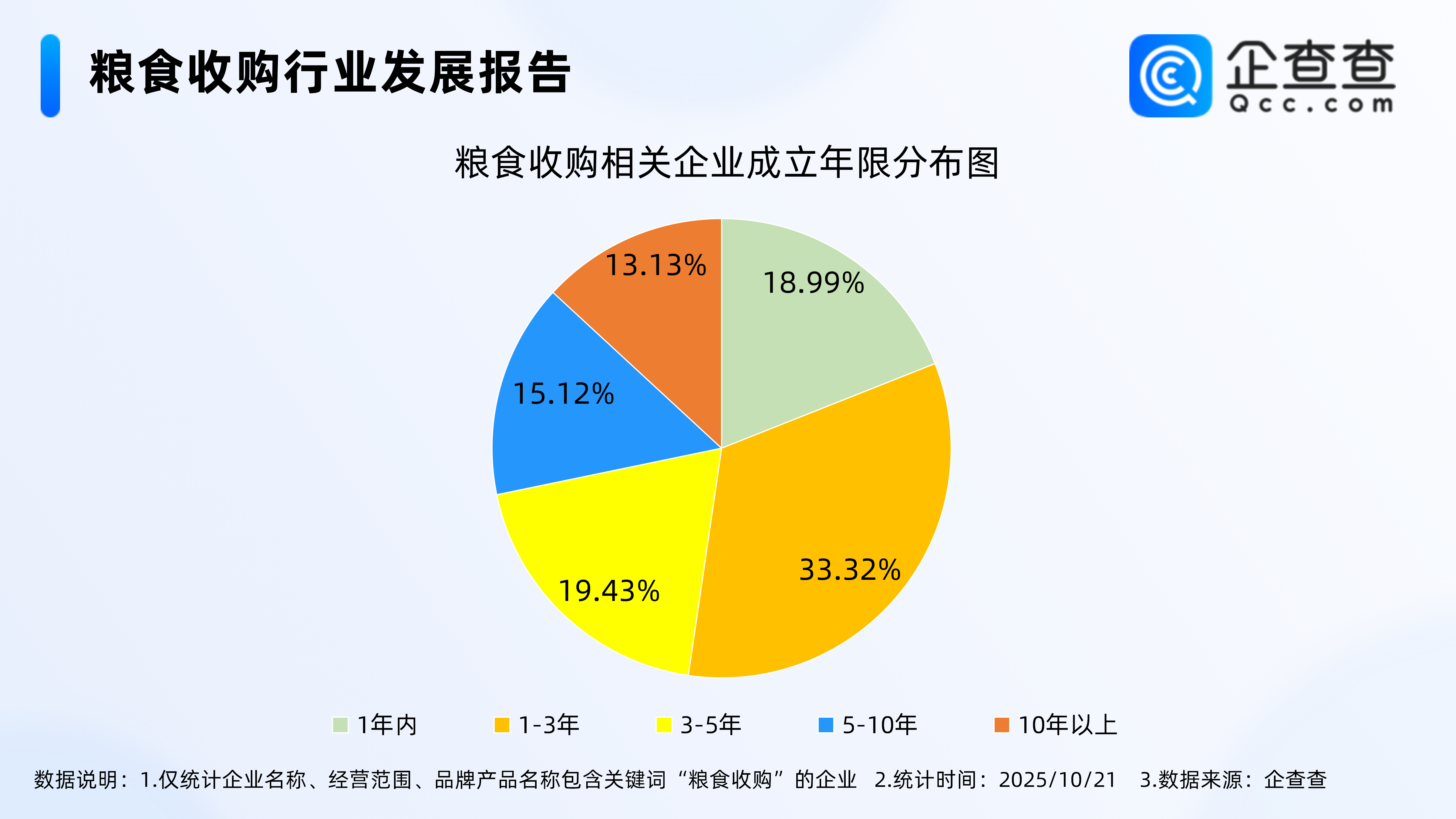 据媒体报道,今年的秋粮收购工作正在陆续展开。相关人士介绍,“十四五”时期我国年均粮食收购量保持在4亿吨以上,当前市场化收购占收购量九成以上,已成为粮食收购的“大头”。秋粮占全年粮食产量的近四分之三,涉及品种多、数量大、范围广。市场化收购有效发挥了畅流通、增活力的作用;政策性收储,包括对小麦、稻谷实行最低收购价政策和对相关品种组织各级各类储备收储,有效发挥了稳预期、兜底线的作用。企查查数据显示亿财配资,国内现存粮食收购相关企业63.8万家。注册量方面,2024年全年注册12.22万家,截至目前,今年已注册9.85万家,其中前9月注册9.52万家亿财配资,同比增长4.06%,从地区分布来看亿财配资,华中地区今年新注册相关企业贡献率最高,为23.94%。存量方面,从经营时间来看,成立年限在1-3年的粮食收购相关企业最多,占比达33.32%。1.国内现存粮食收购相关企业63.8万家