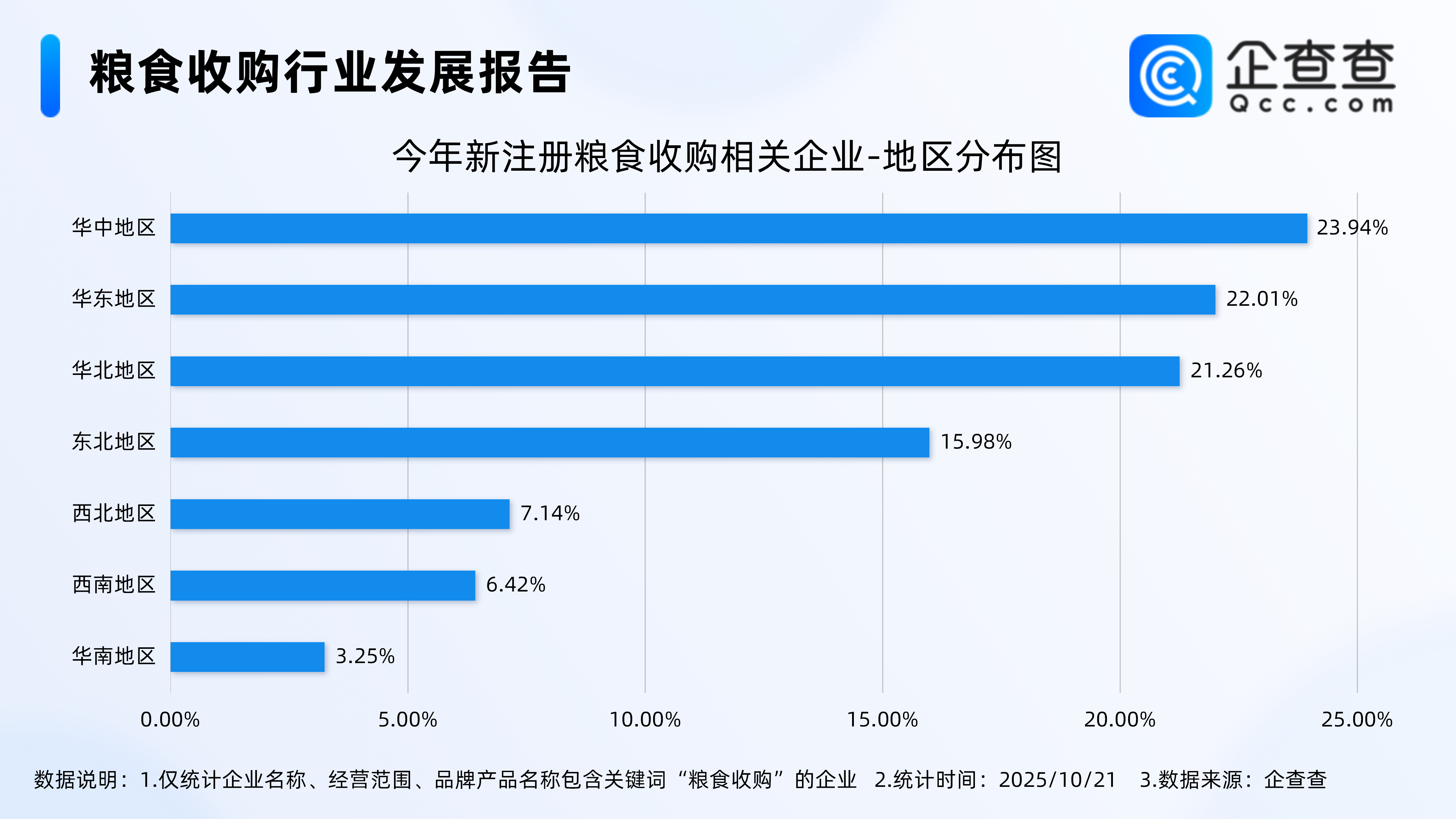 企查查数据显示,注册量方面,2023年粮食收购相关企业全年注册量同比增长28.64%至13.12万家,创近十年注册量峰值。2024年全年注册12.22万家,虽较前一年同比减少,但仍处于高位。截至目前,今年已注册9.85万家,其中前9月注册9.52万家,同比增长4.06%。3.华中地区今年新注册相关企业最多