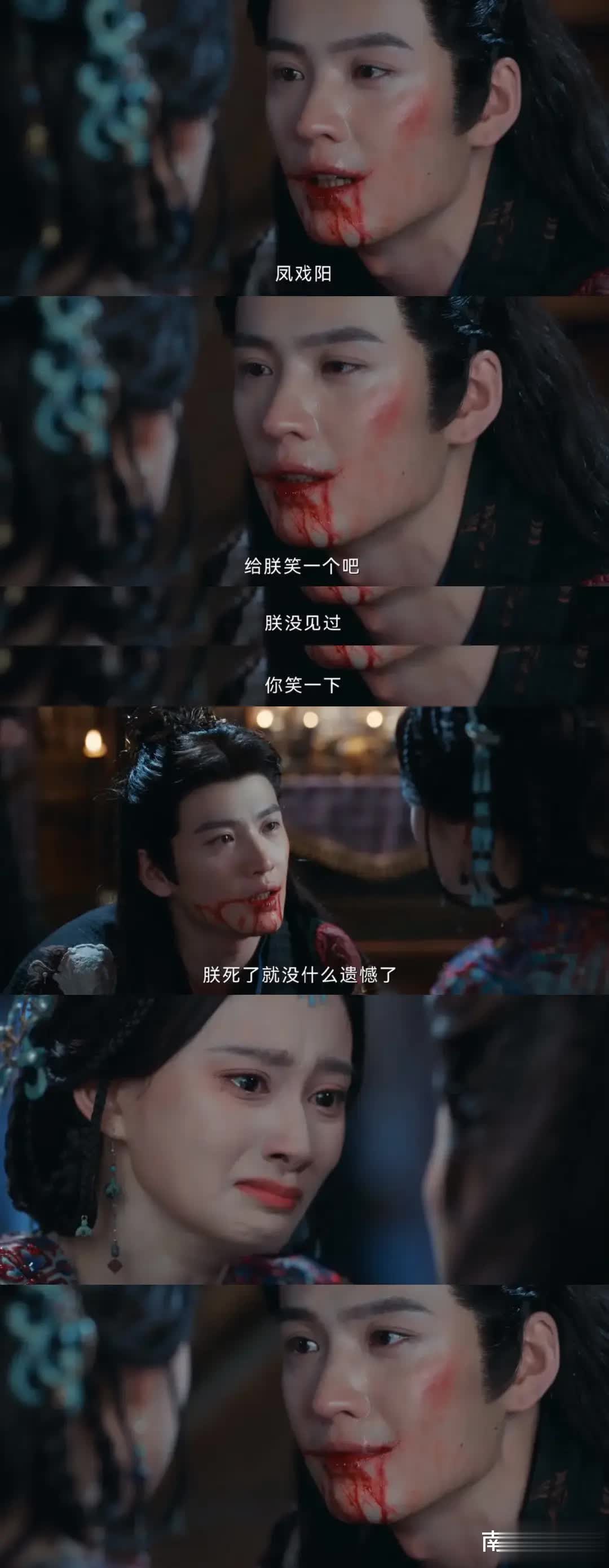 面对夏静石的利剑直指凤戏阳腹中胎儿,一向狂傲不羁、宁死不屈的夏静炎,竟跪地磕头,声嘶力竭地哀求:“放了她,我求你!”他曾放言“你就算把朕千刀万剐,也休想听到一句求饶”,却为一个女人、一个孩子,彻底折断了帝王脊梁。这一跪,不是懦弱,而是爱到极致的卑微。然而,夏静石毫不留情,一剑刺穿凤戏阳腹部,也刺穿了夏静炎最后的希望。他倒在血泊中,望着凤戏阳,喃喃道出此生最后的愿望:“我想看她笑一下……”话音未落,生命已逝。